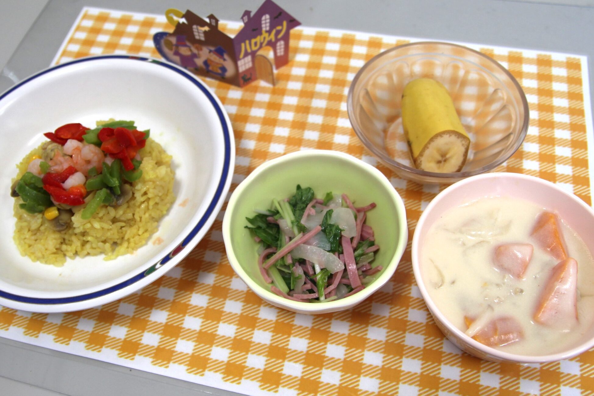 ハロウィンにちなんだ特別メニューとして、昼食には彩り豊かな海老と野菜のパエリアと南瓜シチューを、おやつには手作りの南瓜プリンを提供しました。季節感のあるメニューに、利用者さまからも笑顔が見られました。