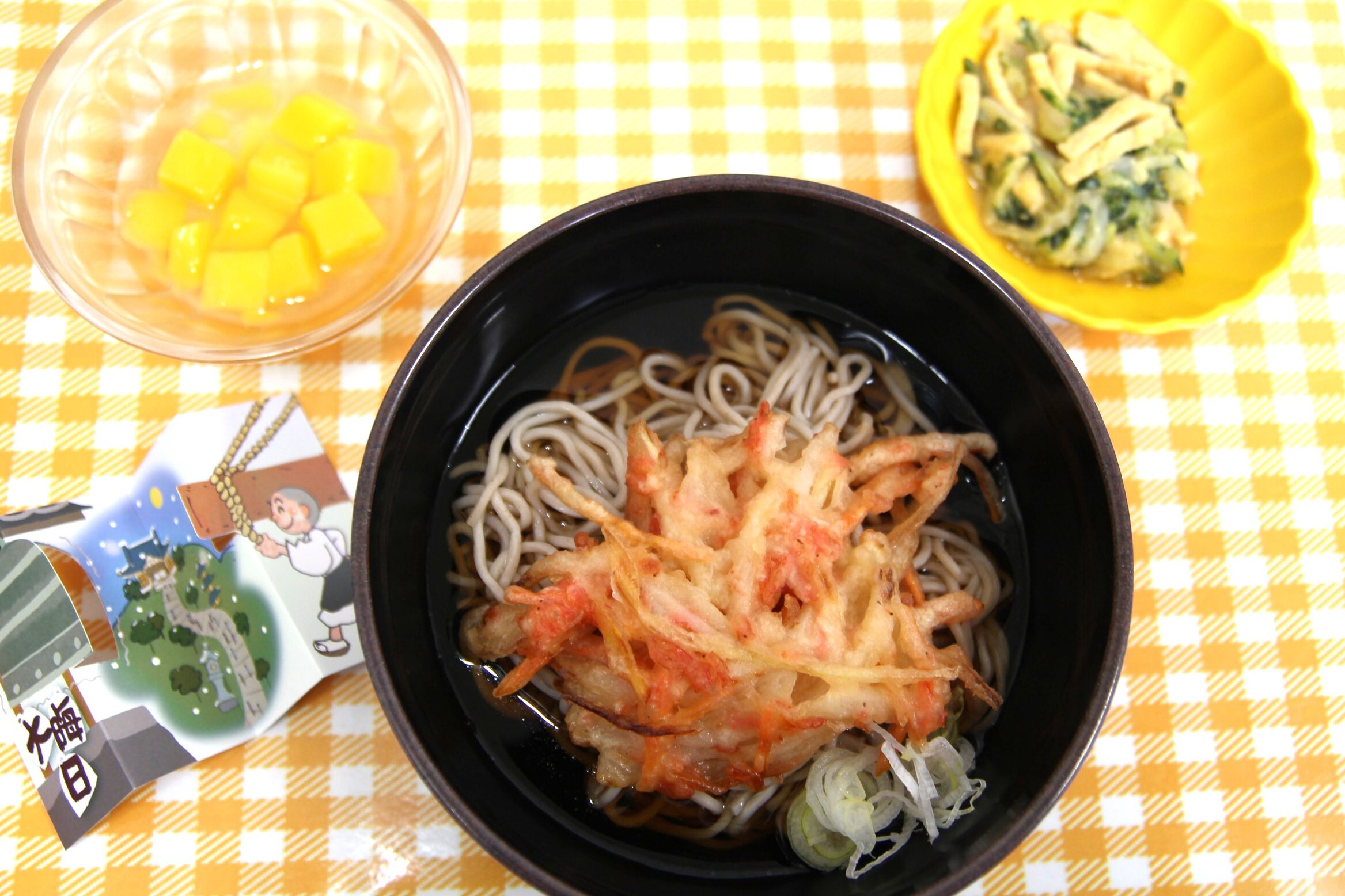 今回は厨房で手作りしたかきあげをそばの上にのせ、ボリュームのある一品となりました。
