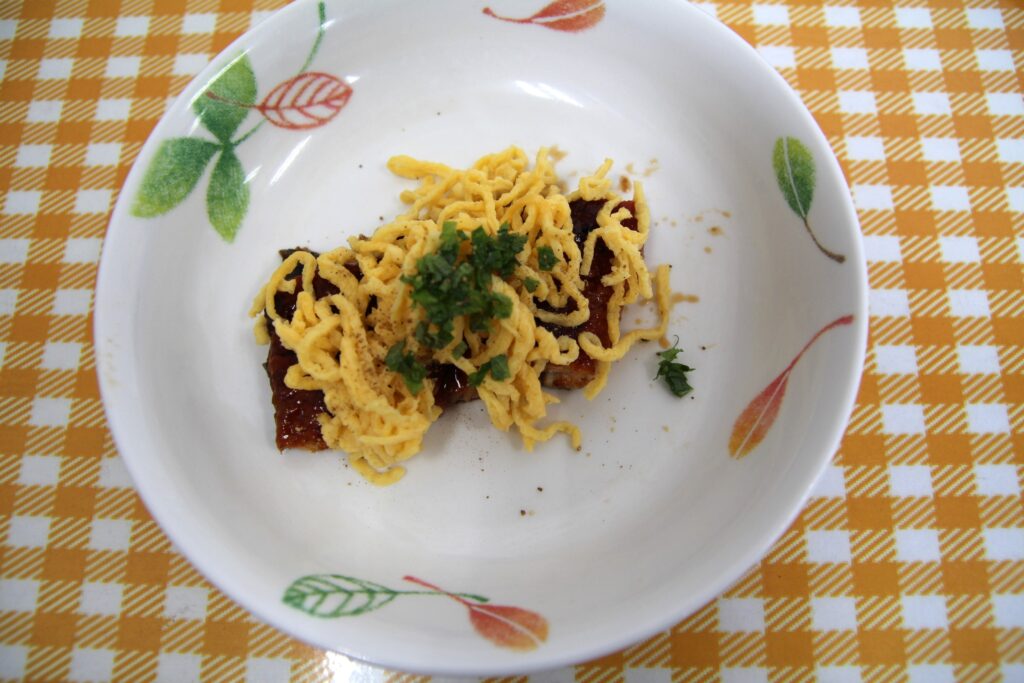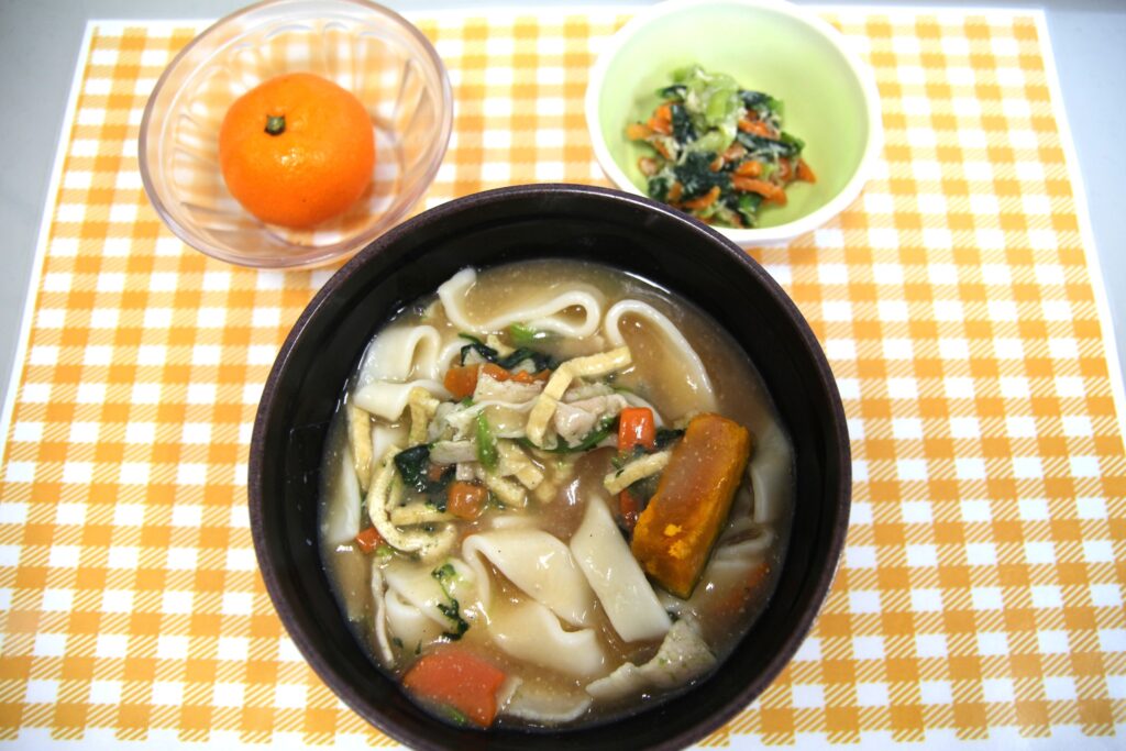 山梨県の郷土料理を、ご高齢の方でも食べやすいようにしてお出ししました。麺は平たく、もっちりした食感で、かぼちゃやほうれんそう、にんじんなど具沢山で栄養価が高いメニューになりました。